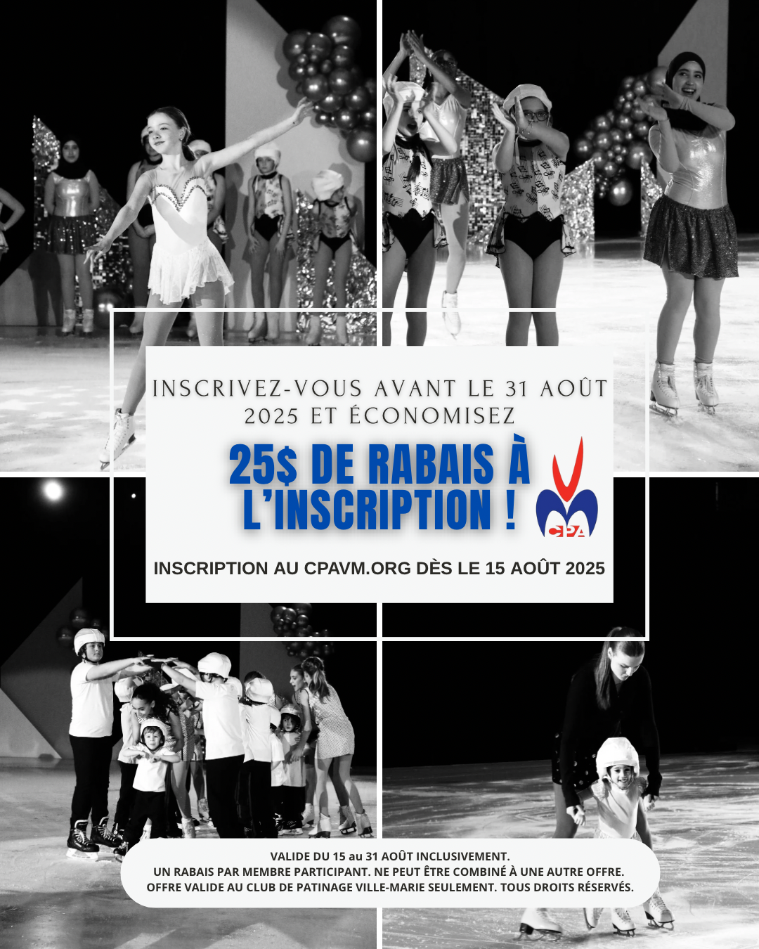 mise à jour : 12 août 2025 TARIFS ET PROMOTIONS SAISON 2025-2026 ** Frais d'adhésion au CPA Ville-Marie : 100$ - NON-REMBOURSABLE ***Frais d'adhésion à Patinage-Canada : 60$ - NON-REMBOURSABLE PROMO DE LA RENTRÉE